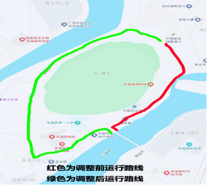 2.调整后路线为“永福全顺充电站→碧水湾→汽车总站→公路养护中心→移动公司→老水厂→老剧院→县政府→司法局→碧桂园→大屯→广福加油站→龙桥→石祥→马陂→亲睦→矮岭客运站→翁村→波寨屯”。
