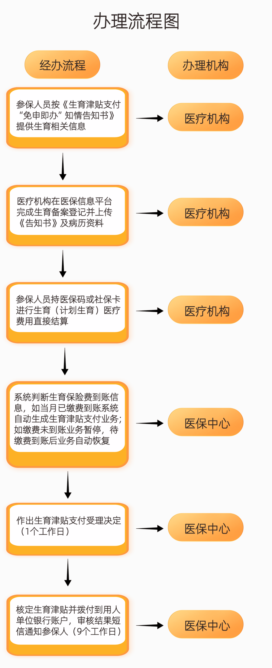参保女职工在已开通便捷服务的定点医疗机构就医后,本人或家属持参保人有效身份证件到定点医疗机构医保科或结算收费处办理生育备案登记,定点医疗机构工作人员向参保人提供《生育津贴支付知情告知书》,参保人授权定点医疗机构上传病历资料并提供生育相关信息后,再按生育医疗费用直接结算流程办理医保结算。