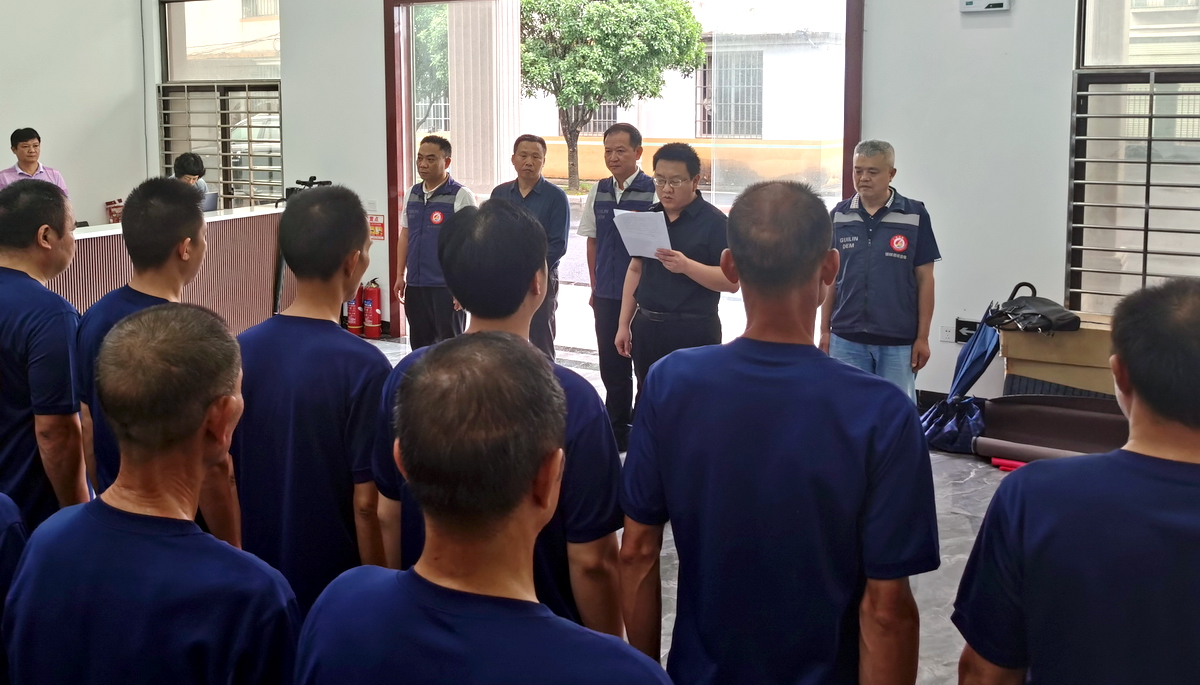 桂林市应急管理局副局长杨灏(左六),永福县人民政府副县长文建伟(左七),桂林市应急管理局火灾科科长全永忠(左四)、永福县应急管理局局长黄山川(右六)等领导为“桂林市应急救援队永福县分队”揭牌