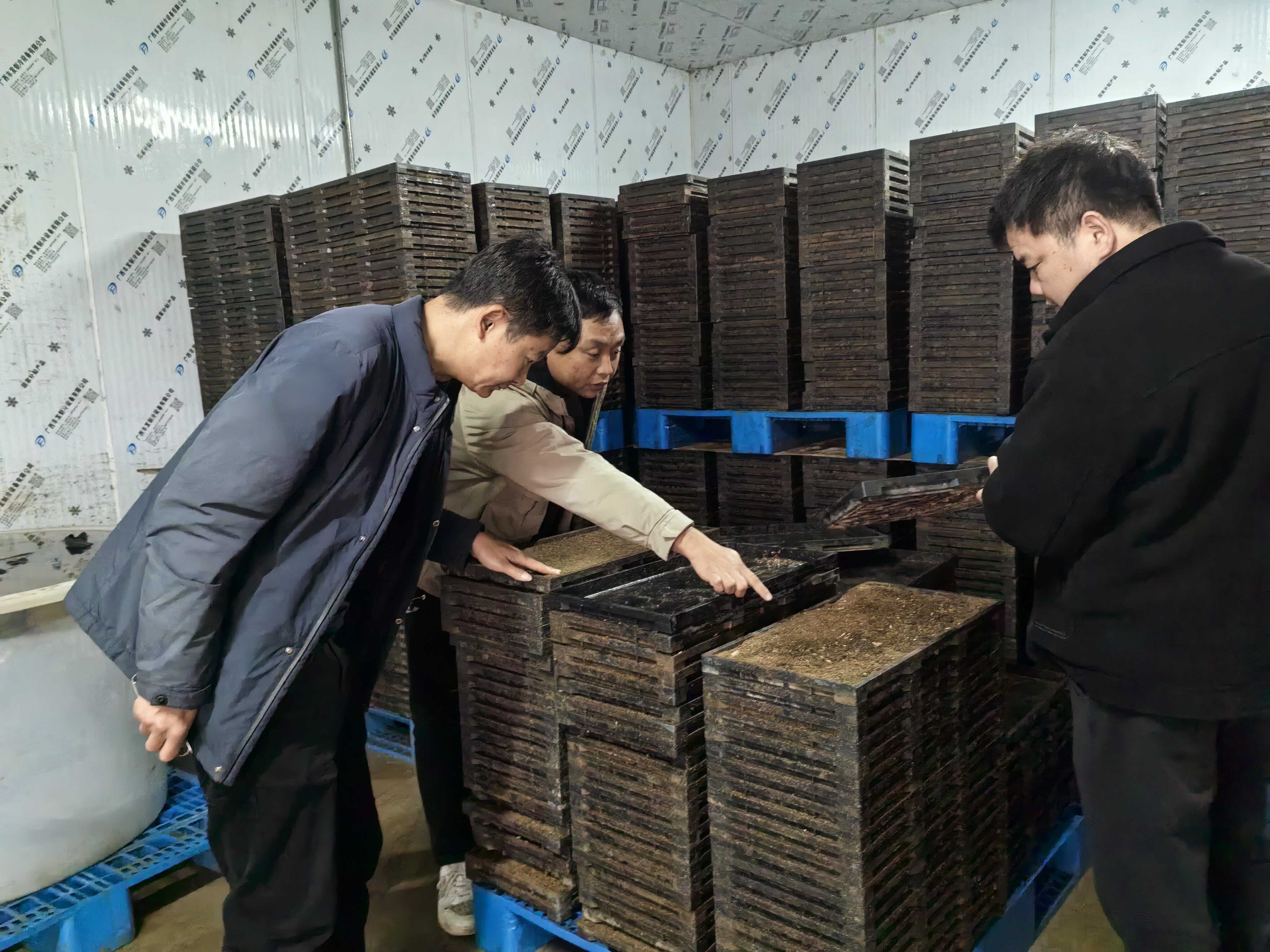 韦波(左一)调研谷种催芽情况