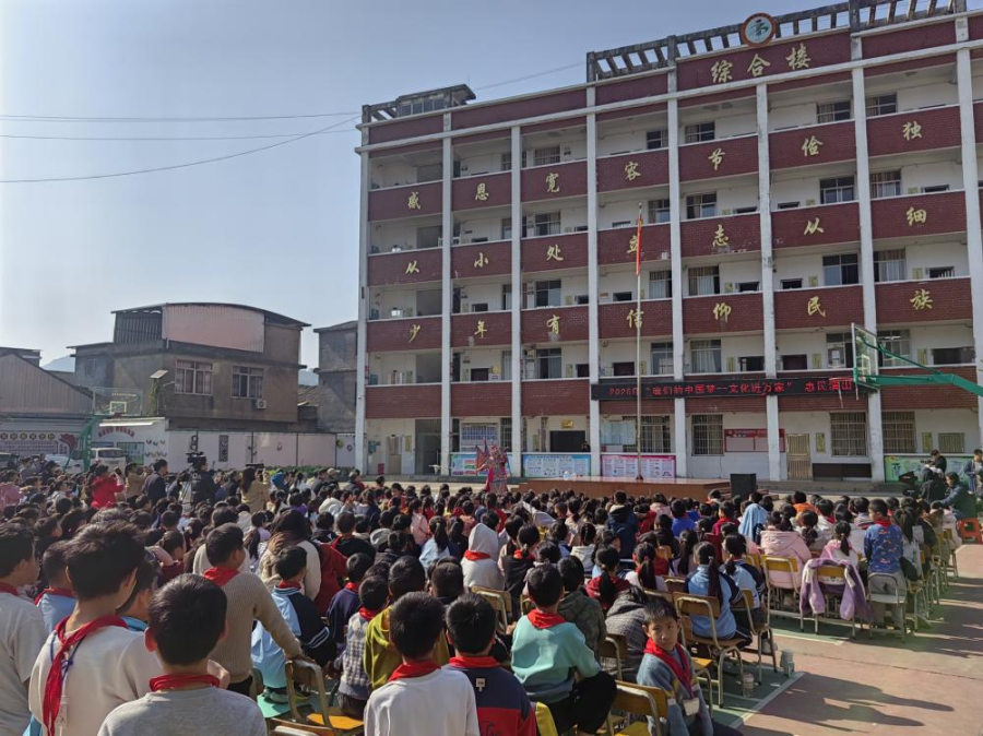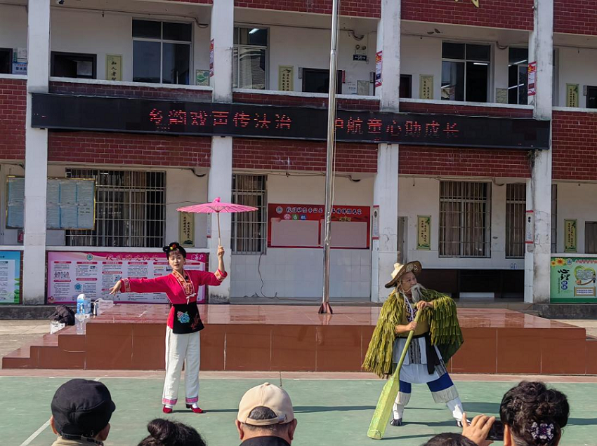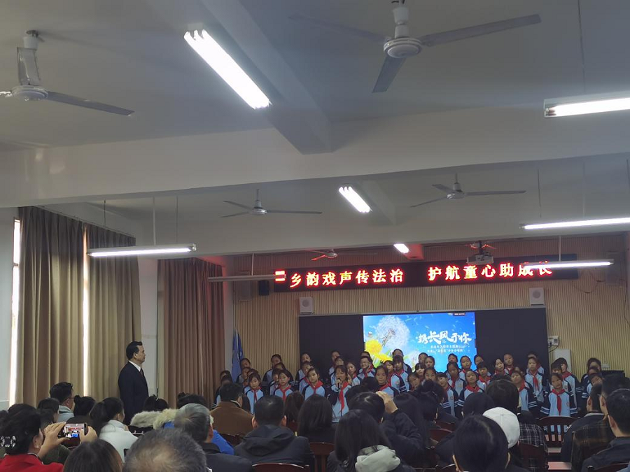 法治课堂紧随戏曲演出展开。永福县检察院“呵护未来”志愿服务队的赖家明老师结合实际案例,生动讲解了未成年人保护法律知识。随后,堡里小学“蒲公英少年合唱团”演唱《携长风予你》,纯净歌声传递出对未来的憧憬与对法治的信任,将现场气氛推向高潮。