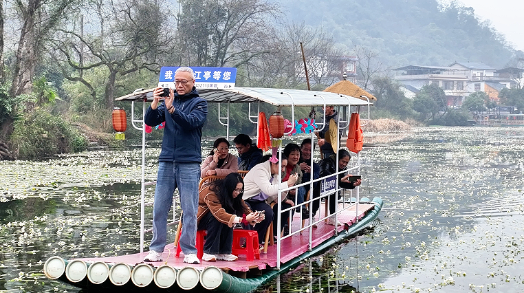 来自阳朔的游客卢女士赞叹道:“雾锁山头山锁雾,天水相连水连天。每年过年我们都要来看看,这花实在太美了!”原生态的水上花景,成为今年新春最出圈的自然打卡点。