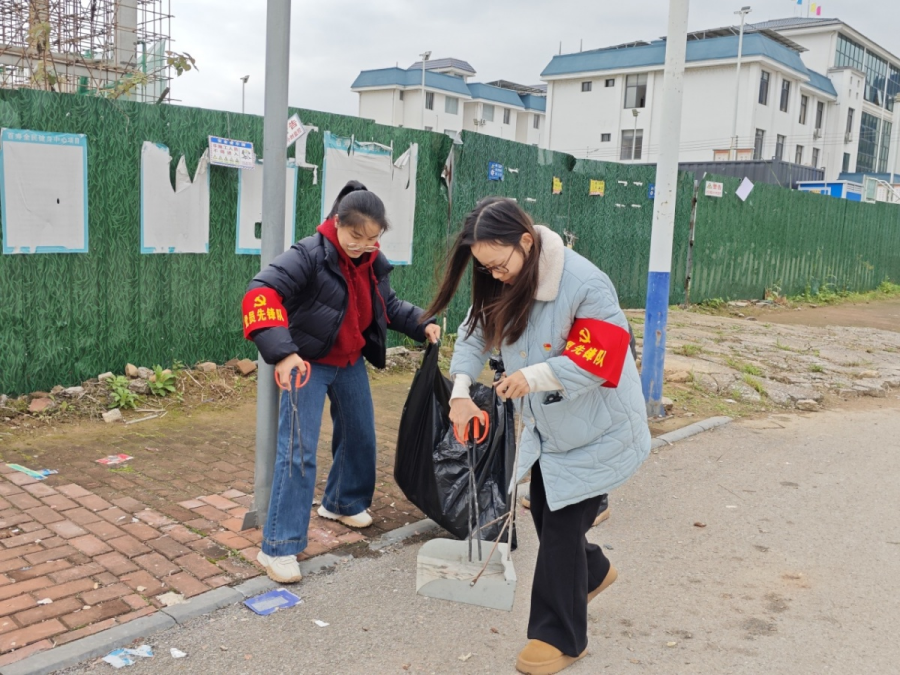 活动中,党员们佩戴“党员先锋队”袖标,身着志愿服装,手持扫帚、铁钳、垃圾袋等清洁工具,分组协作、干劲十足。在镇区河道沿岸,队员们细致清理散落在草丛、水边的塑料袋、纸屑等垃圾,不放过任何一个卫生死角。大家认真清扫路面落叶与杂物,搬运堆积的垃圾。尽管天气寒冷,但大家热情高涨,忙碌的身影成为一道道亮丽的风景线。