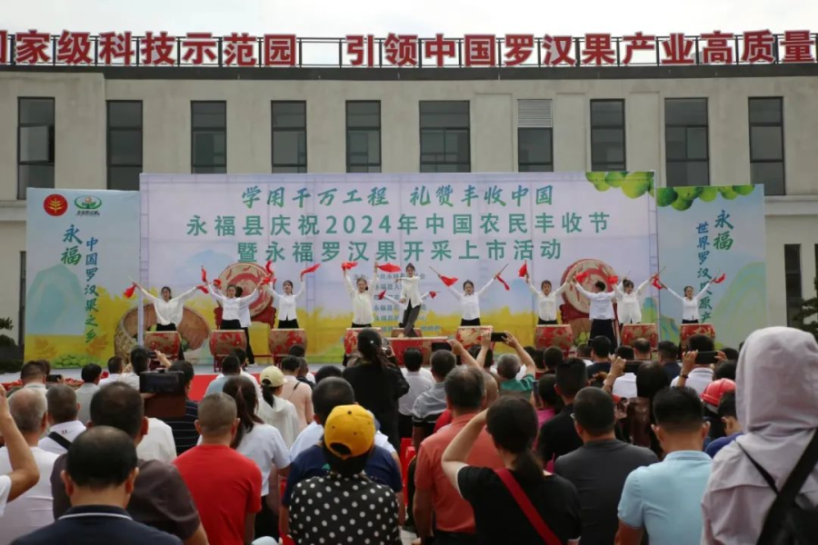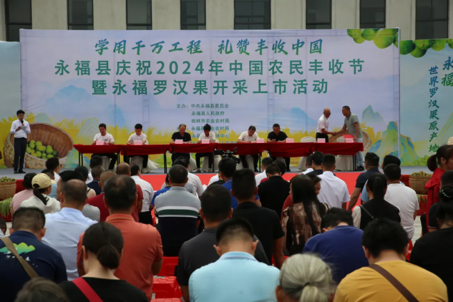 金秋送爽,稻香四溢,第七届中国农民丰收节如期而至。为展现永福农业农村发展新成就,展示永福特色农产品,特别是罗汉果产业发展成果。9月22日,永福县在罗汉果科技示范园举办庆祝2024年中国农民丰收节暨永福罗汉果开采上市活动。桂林市农业农村局副局长魏承林,县领导韦文周、陆铁拓等领导嘉宾出席活动。