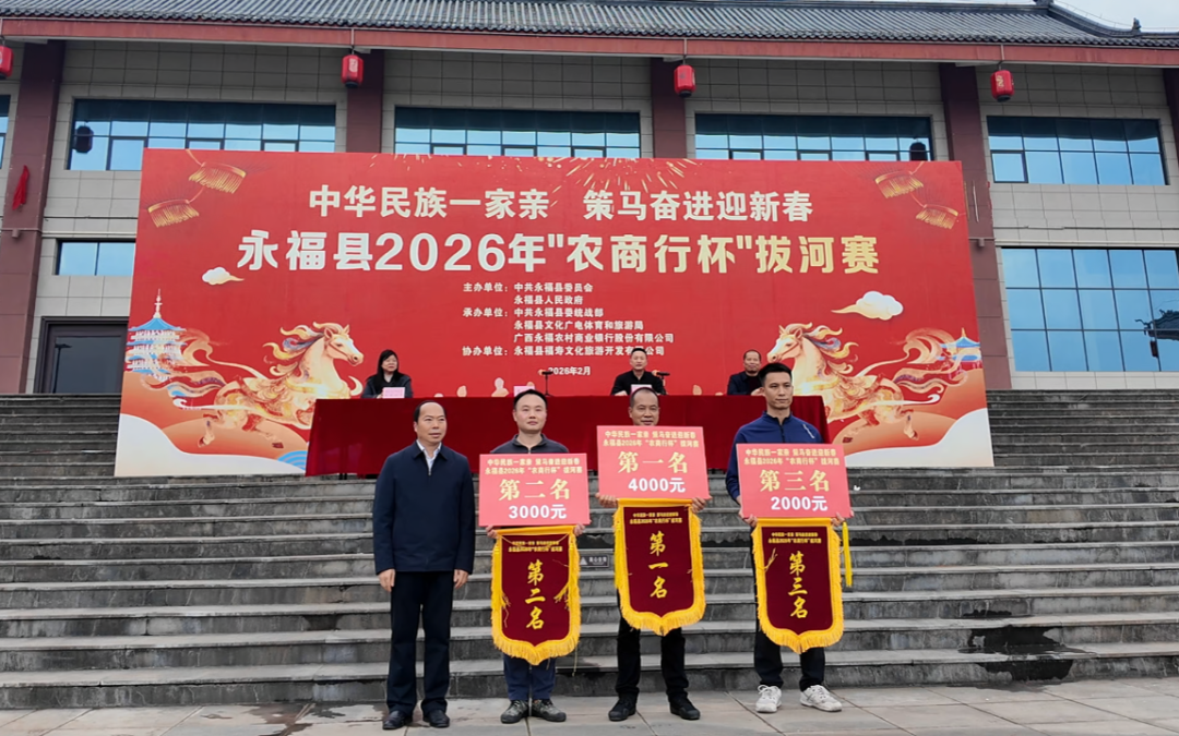 经过激烈角逐,最终百寿镇新隆村代表队获得本次拔河赛的第一名,永福镇代表队获得第二名,广福乡代表队获得第三名。出席活动的领导嘉宾现场为获奖队伍进行了颁奖。