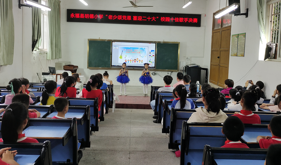 在“双减”的大背景下,为将“双减”进一步落到实处,丰富学生的课余文化生活,营造积极和谐的校园文化氛围, 5月26日下午,明德小学举行“老少颂党恩,喜迎二十大”校园十佳歌手比赛。