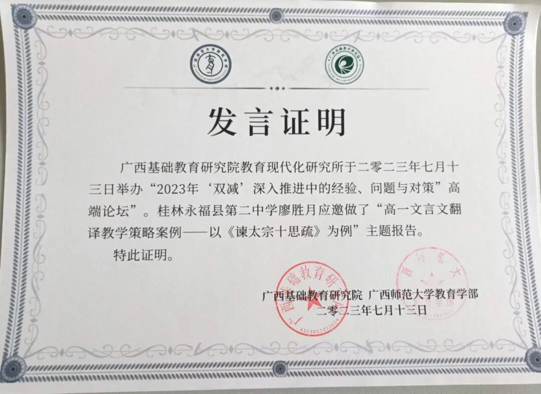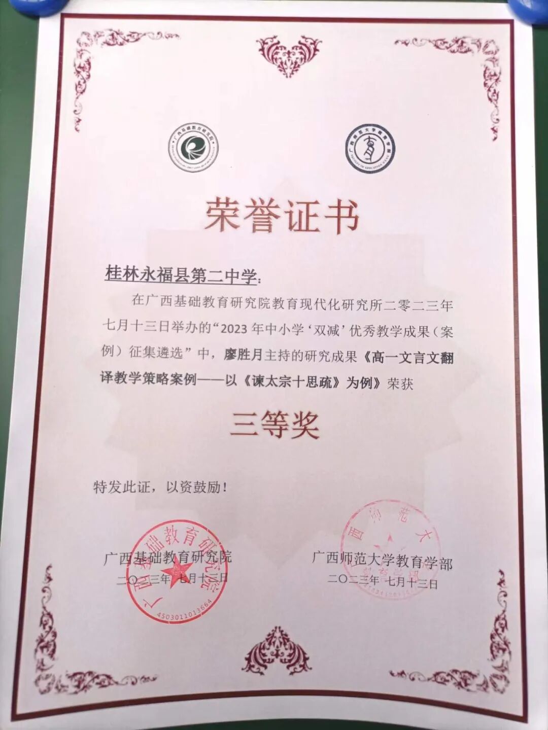 桂林市永福县第二中学在广西基础教育研究院教育现代化研究所举办的“2023年中小学‘双减’优秀教学成果(案例)征集遴选”中,廖胜月主持的研究成果《高一文言文翻译教学策略案例——以《谏太宗十思疏》为例》荣获三等奖。
