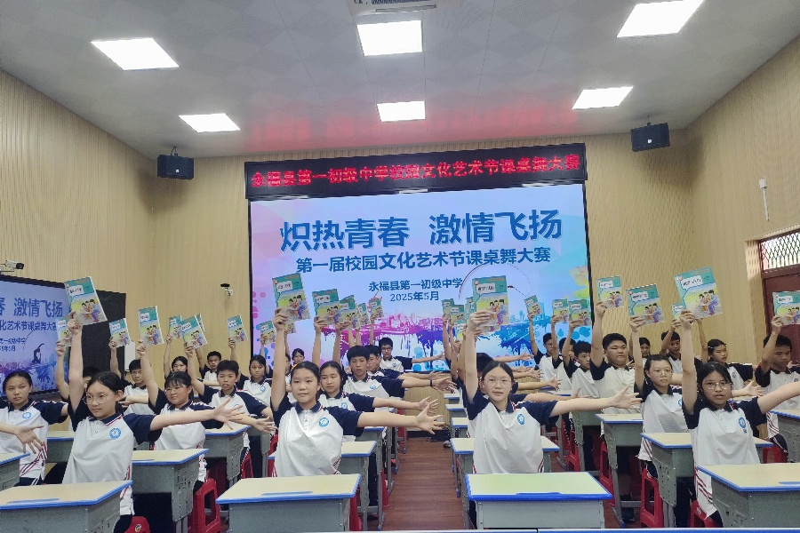 为深化“双减”政策落地,践行“五育并举”育人理念,5月21日,永福县第一初级中学举办“双减”特色课桌舞大赛。全校七、八年级共25个班级的1300余名师生以课桌为舞台,用律动诠释青春活力,展现新时代校园教育的温度与创新。