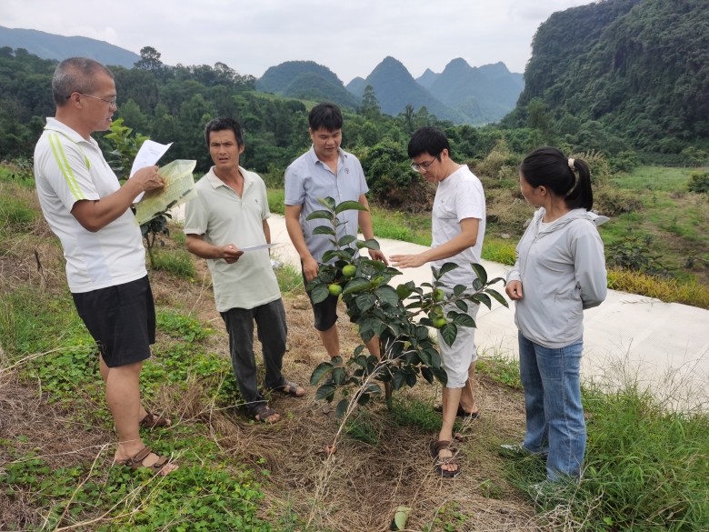 引优种,破瓶颈——瞄准高端市场,引进“太秋”这一兼具脆甜多汁、无涩早熟优势的新品种,建立标准化试种园。农技专家全程驻点指导,攻克桂北地区栽培适应性难关,实现技术突破。在三皇镇古城村永福县利铭种植专业合作社种植基地内,县水果站技术人员实地指导,与种植户一道探讨挂果中后期树体水肥管理和病虫综合防治;在百寿镇王家胆屯太秋甜柿种植园,指导种植户进行拉枝整形,供肥壮苗。