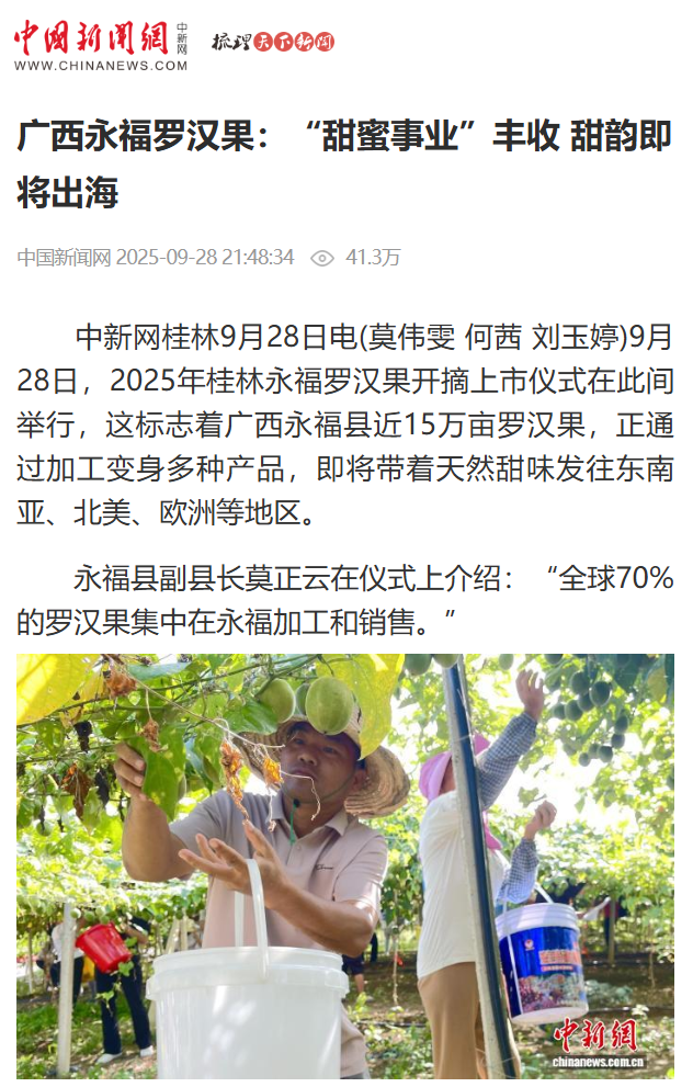 中新网桂林9月28日电(莫伟雯 何茜 刘玉婷)9月28日,2025年桂林永福罗汉果开摘上市仪式在此间举行,这标志着广西永福县近15万亩罗汉果,正通过加工变身多种产品,即将带着天然甜味发往东南亚、北美、欧洲等地区。