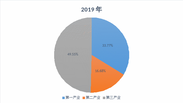 全年三次产业稳中有增,经济总体微幅调整。初步核算,地区生产总值(按可比价格计算)比上年增长7.2%。其中,第一产业增加值增长6.2%;第二产业增加值增长13.7%;第三产业增加值增长5.8%。三次产业增加值占地区生产总值的比重分别为33.8%、16.7%和49.6%。人均地区生产总值比上年增长6.6%。