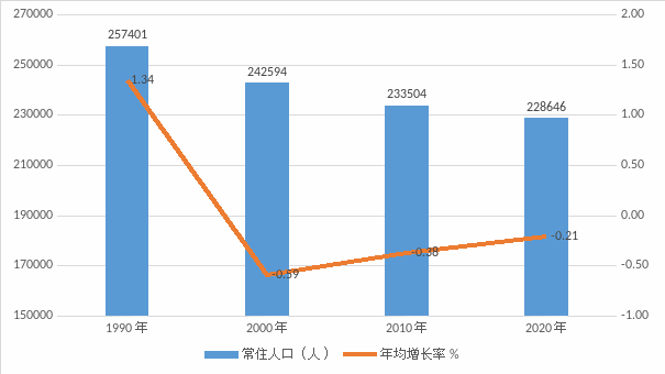 全县常住人口[3]为228646人,与2010年第六次全国人口普查的233504人相比,十年共减少4858人,下降2.08%,年平均下降率为0.21%。