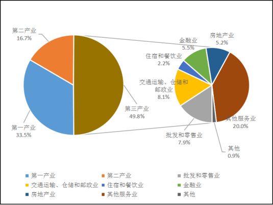 全年全县批发和零售业增加值比上年下降6.8%;交通运输、仓储和邮政业增加值下降8.1%;住宿和餐饮业增加值下降28.6%;金融业增加值增长9.1%.房地产业增加值增长6.9%;其他服务业增加值增长1.1%.