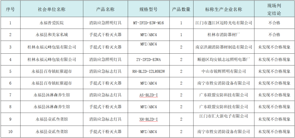 永福县消防救援大队2024年“双随机、一公开”的消防产品监督抽查情况汇总表