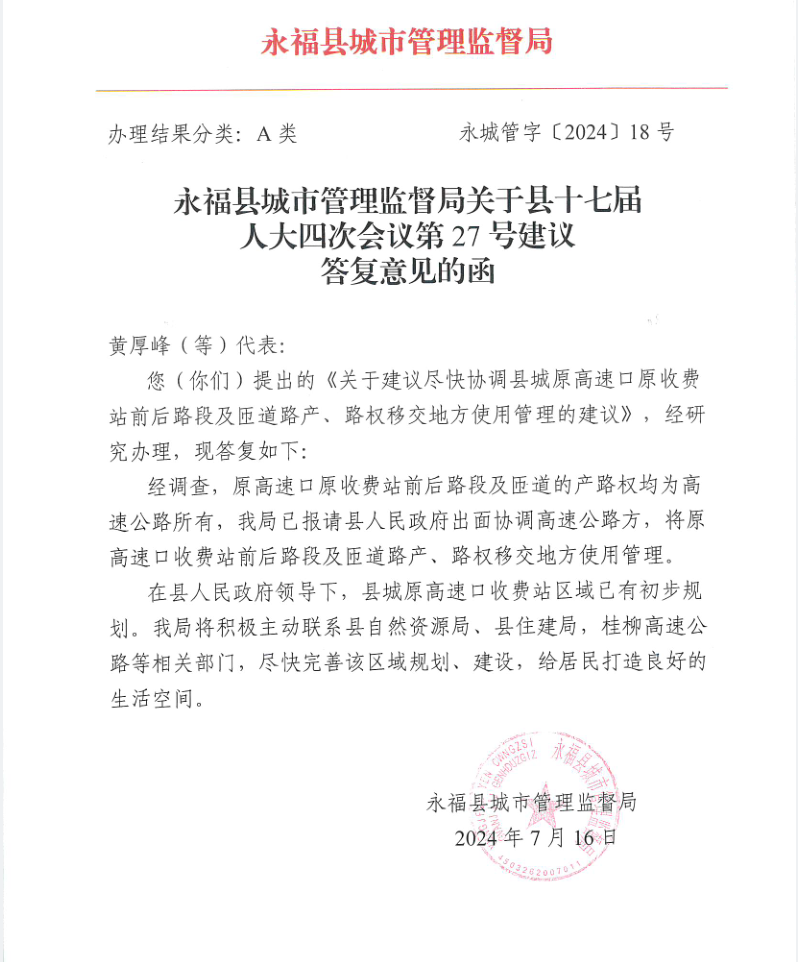 永福县十七届人大四次会议第27号建议的答复