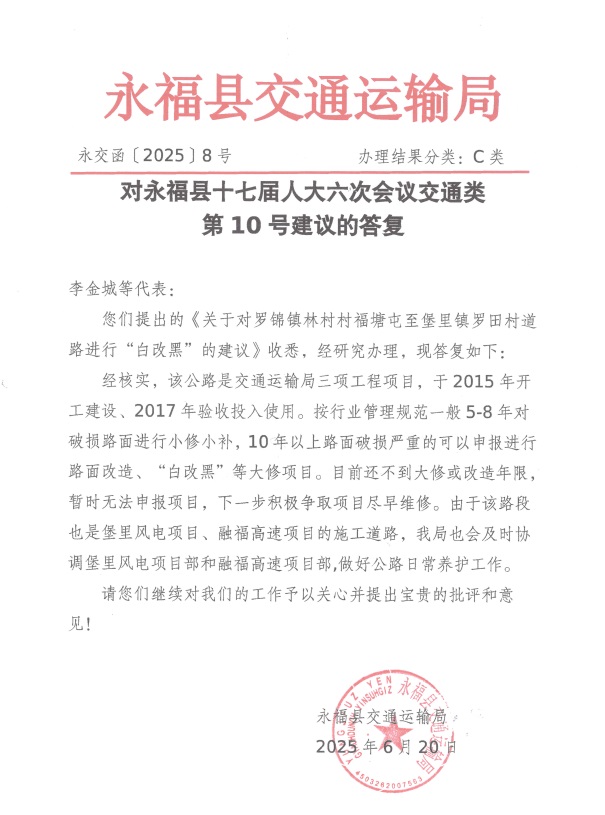 永福县交通运输局对永福县十七届人大六次会议交通类第10号建议的答复