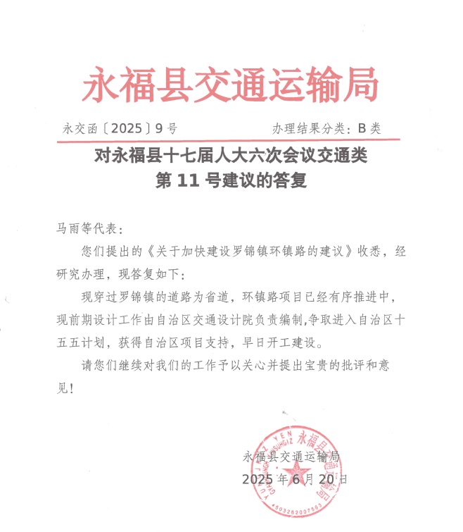 永福县交通运输局对永福县十七届人大六次会议交通类第11号建议的答复
