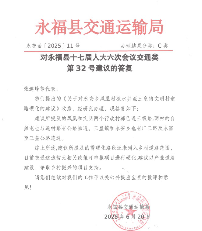 永福县交通运输局对永福县十七届人大六次会议交通类第32号建议的答复