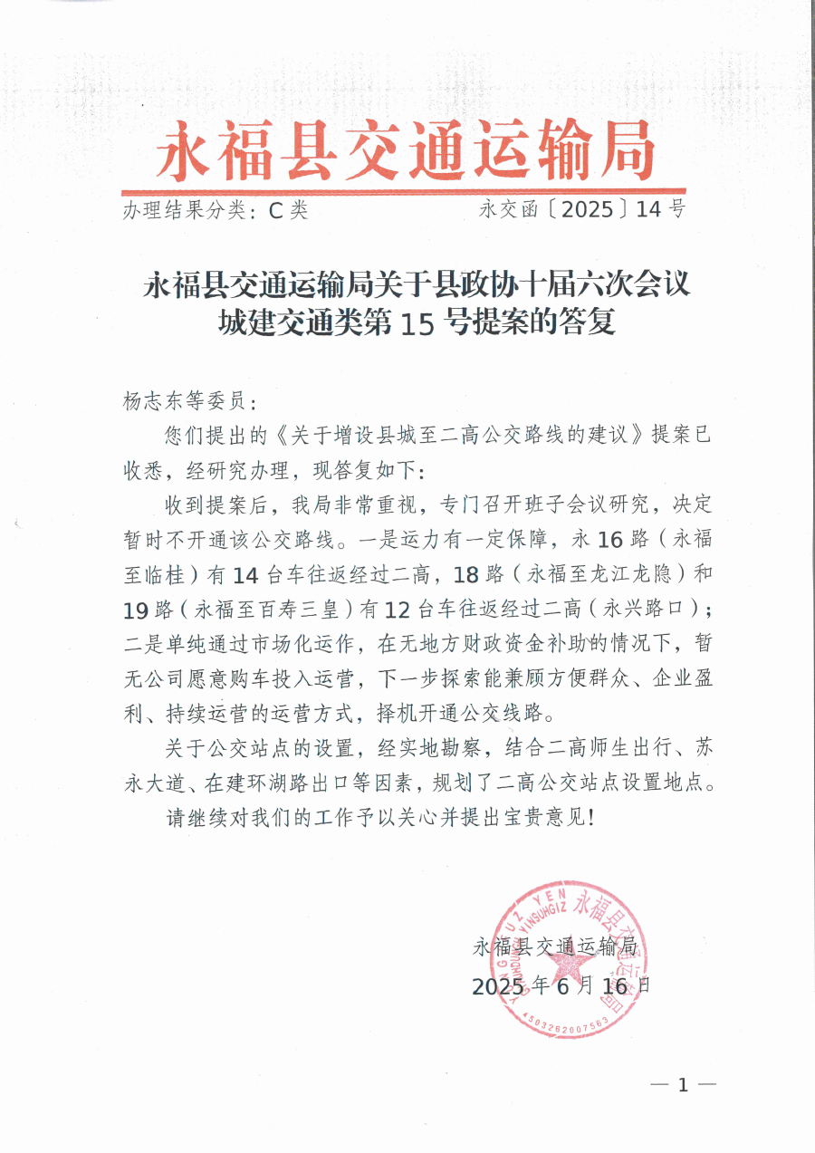 永福县交通运输局关于县政协十届六次会议城建交通类第15号提案的答复