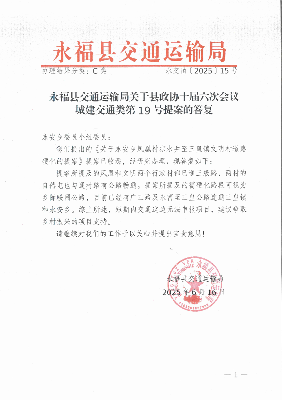 永福县交通运输局关于县政协十届六次会议城建交通类第19号提案的答复