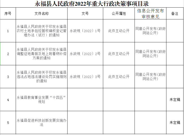 永福县人民政府2022年重大行政决策事项目录