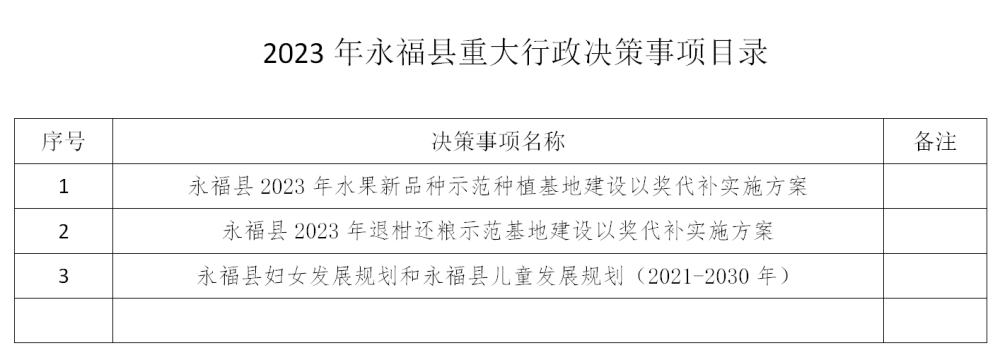 永福县人民政府2023年重大行政决策事项目录