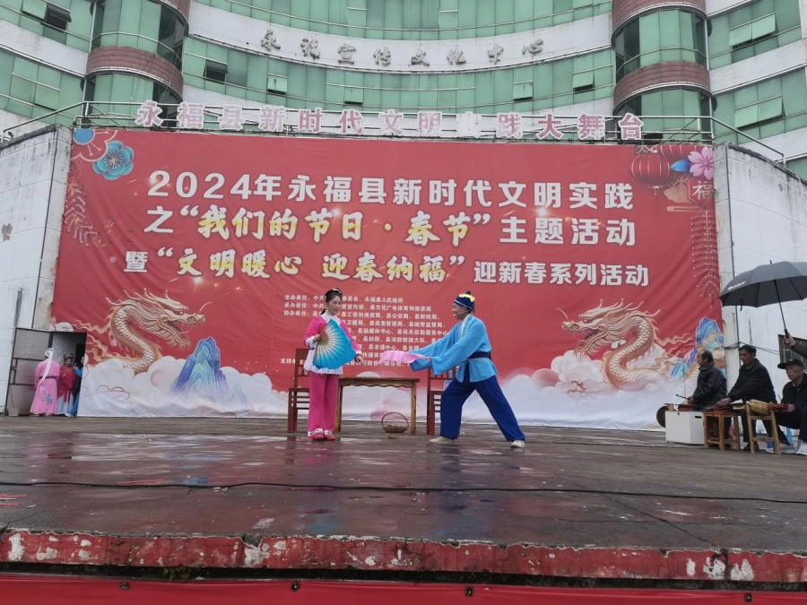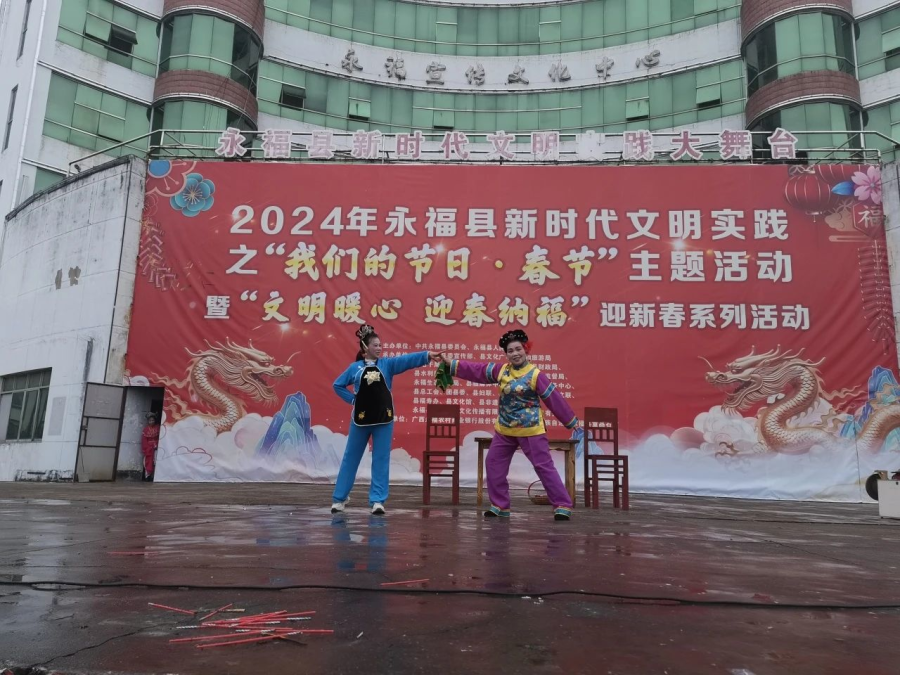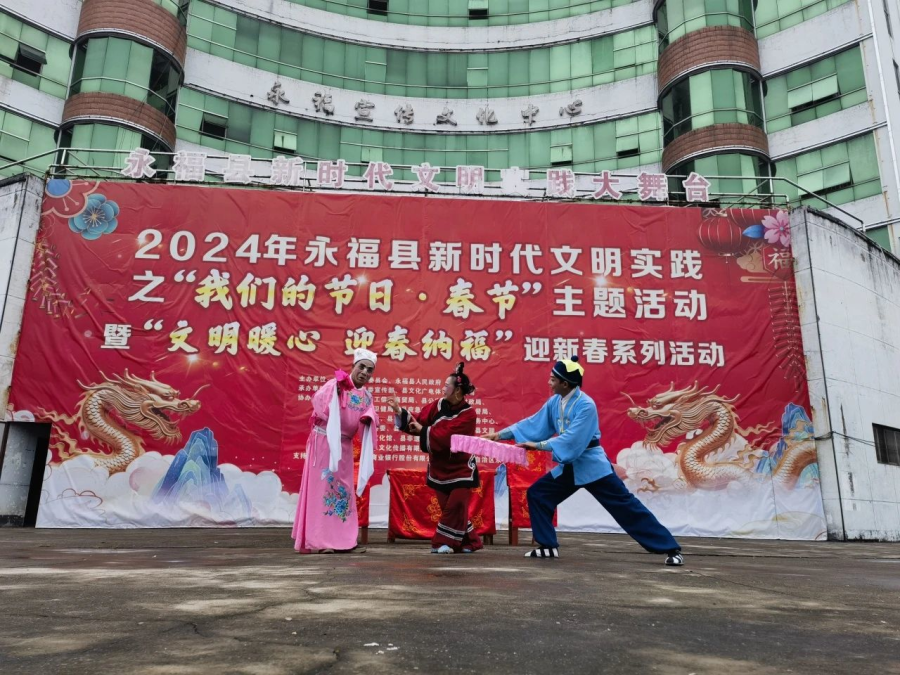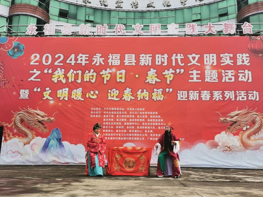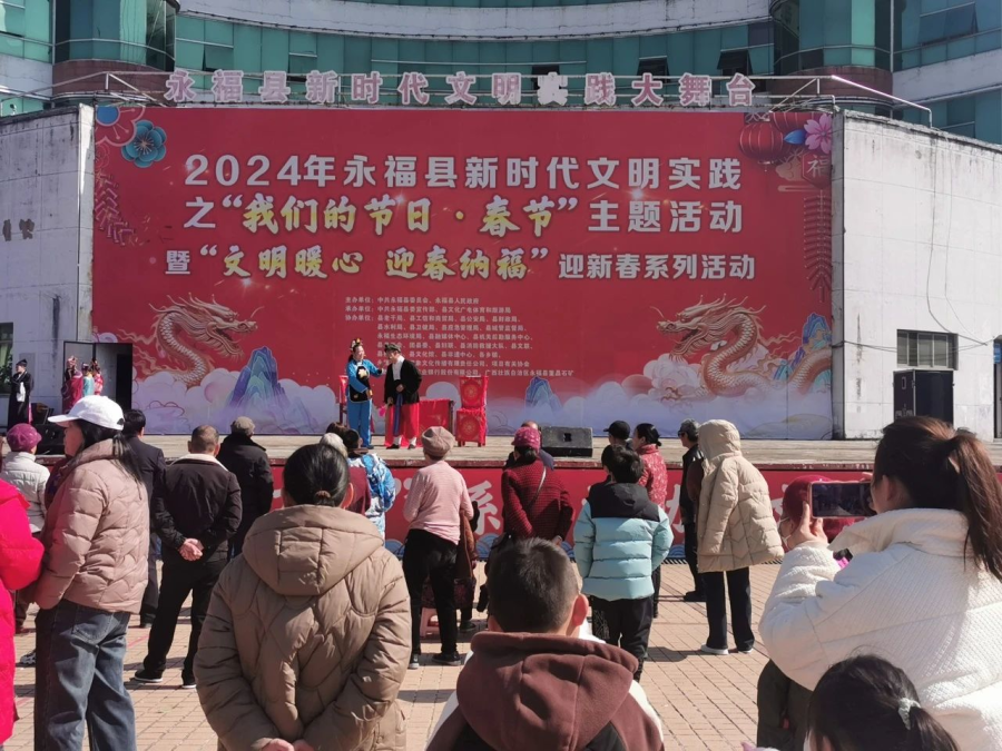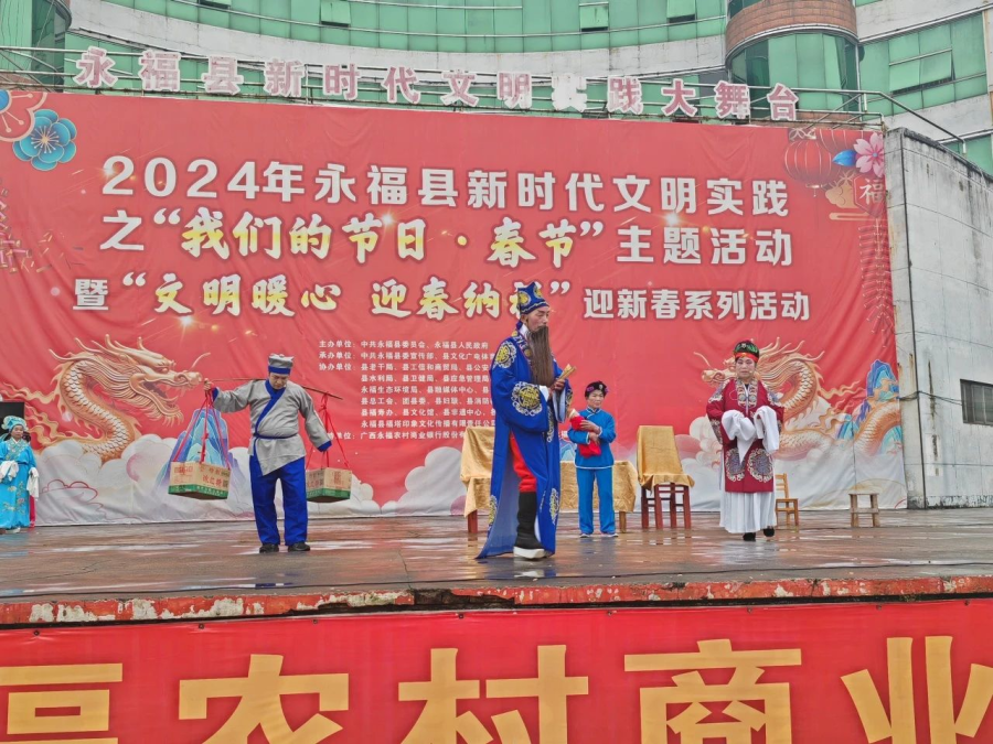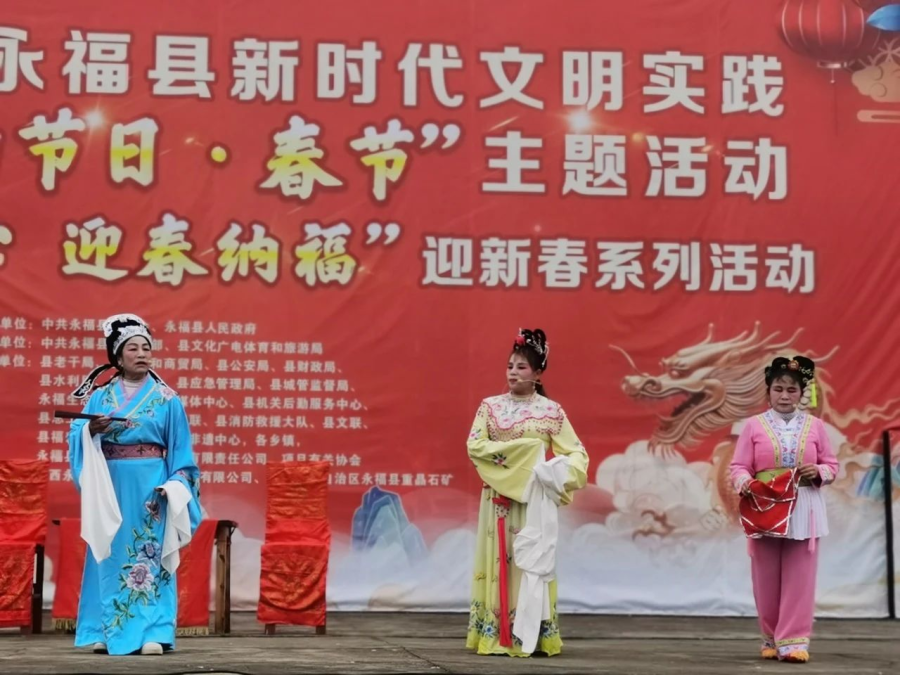 过大年看大戏。一方水土养一方人,永福人当然最爱看彩调,“哪嗬嗨呀”热热闹闹的唱起来,过年期间,福寿广场的舞台上《金玉缘》、《秦光明上京》等大戏轮番上演,彩调爱好者们好好地过了一把瘾。