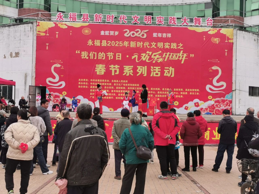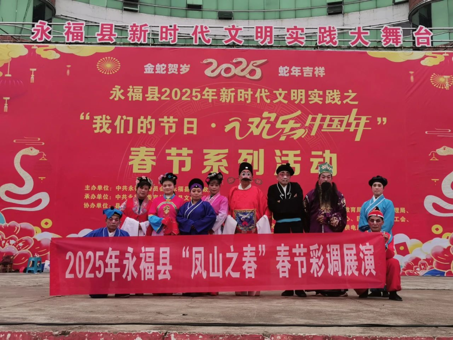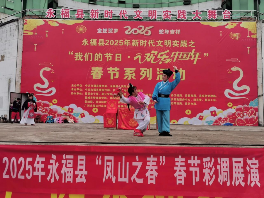 彩调作为永福地方特色文化的瑰宝,以其独特的唱腔、幽默诙谐的表演风格深受群众喜爱。“凤山之春”彩调展演活动于1月30日(大年初二)在福寿广场举行。展演中,演员们的一招一式、一颦一笑都拿捏得恰到好处,生动地演绎出剧中人物的喜怒哀乐,引得台下观众阵阵喝彩。台下观众们看得如痴如醉,现场不时爆发出热烈的掌声和欢呼声。彩调展演不仅让观众们欣赏到了精彩的表演,更让这一古老的艺术形式在新时代焕发出新的生机与活力,让更多的人了解和喜爱上彩调文化。