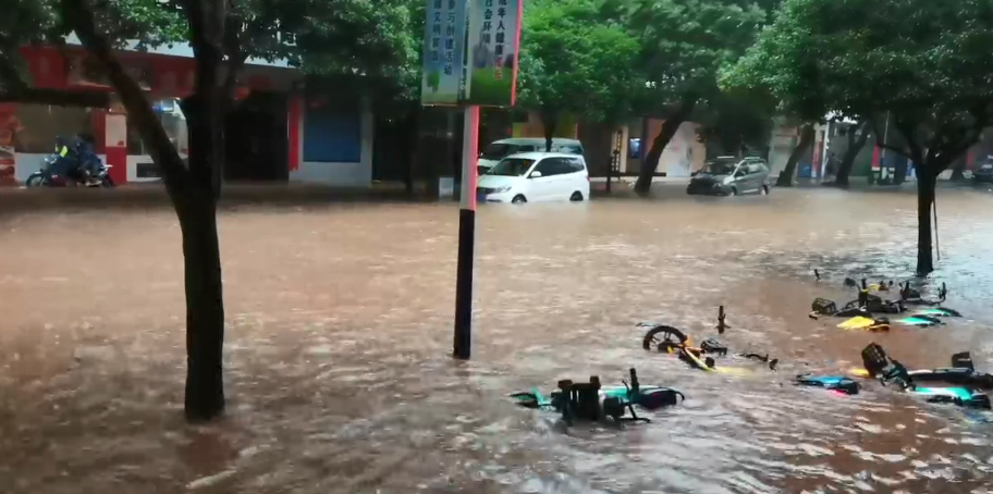 永福县第一小学附近路段积水没过轮胎。