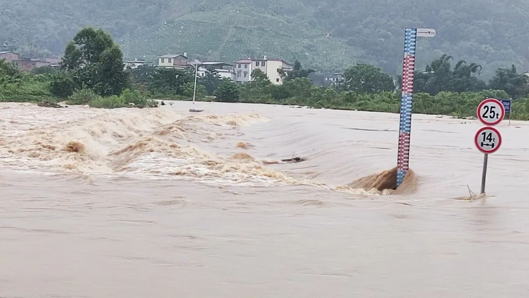 永福镇大苏村,洪水淹没道路,无法通行。