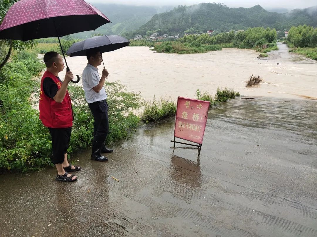 广福乡龙桥村龙桥小学路口桥面漫水,及时设置禁行标志,乡长及第一书记现场查看情况。