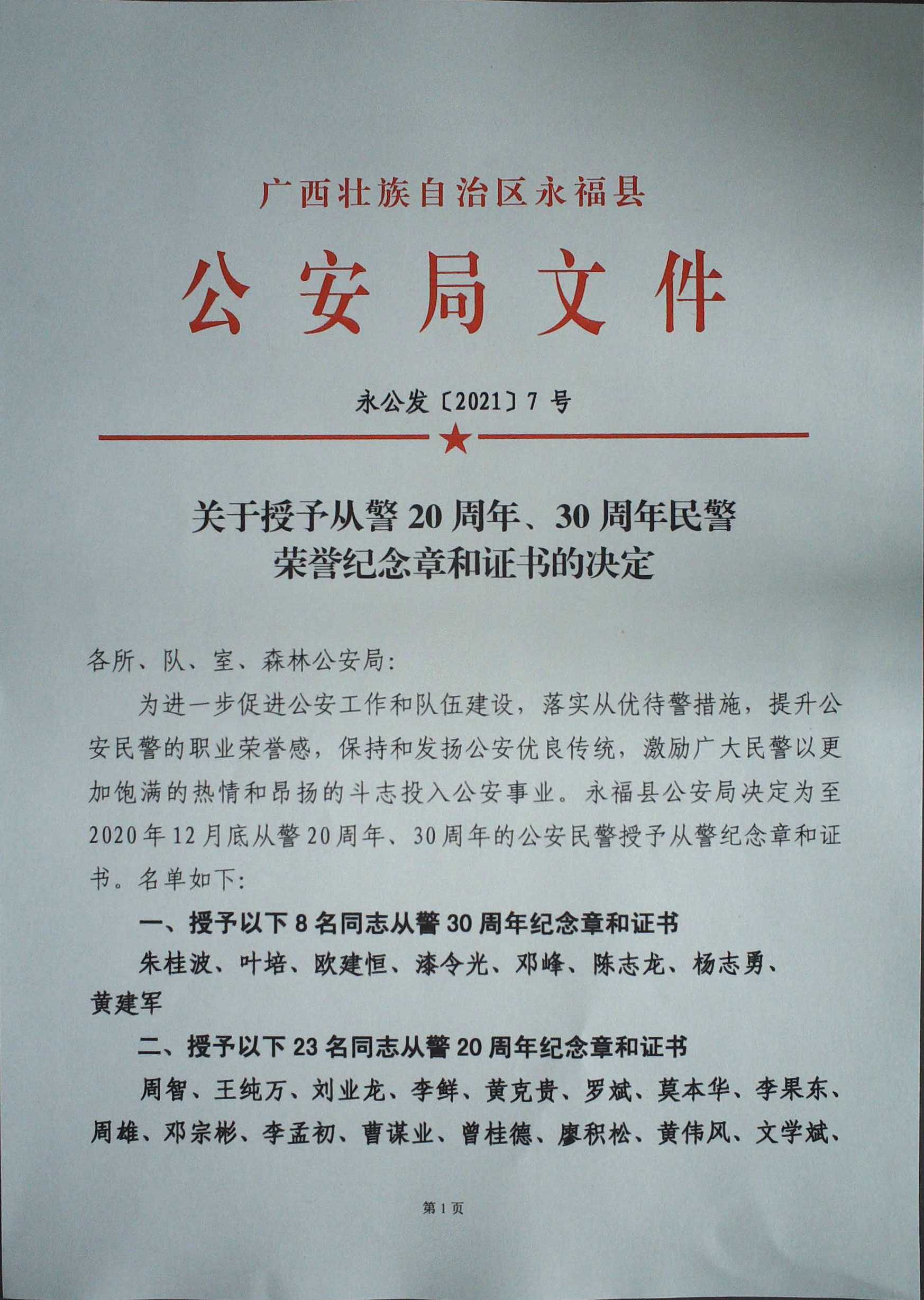 永公发[2021]7号 关于授予从警20周年、30周年民警荣誉纪念章和证书的决定