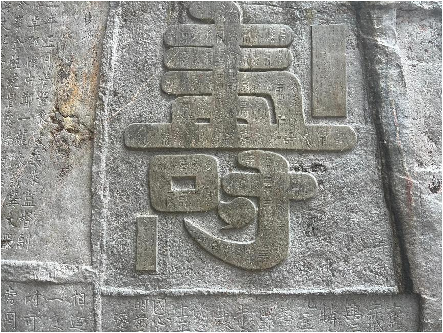 “寿”字石刻俗称百寿图,于1229年由知县史渭下令刻写。这些“寿”字一字一体,无一雷同。这一百寿图是我国现今所见时代最早的集古代单字诸体于一身的摩崖石刻。1981年,百寿图被列为自治区重点文物保护单位,其拓件已被北京故宫博物院珍藏。1982年百寿岩被收入《中国名胜大词典》。