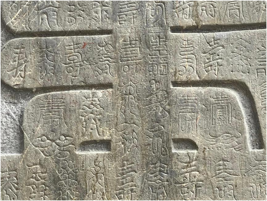 永福县地方文化研究者刘家毅告诉记者,大“寿”字长175厘米,宽148厘米,其中共包含了101个“寿”字。“里面镌刻了100个小‘寿’字,加上大的那个共101个。我们中国讲究吉祥数字,要么99,要么过100。99咱们不满足,要过100,所以说是101个。这也是在告诉人们可以突破‘百寿’,不要给自己的生命设上限。”刘家毅说。
