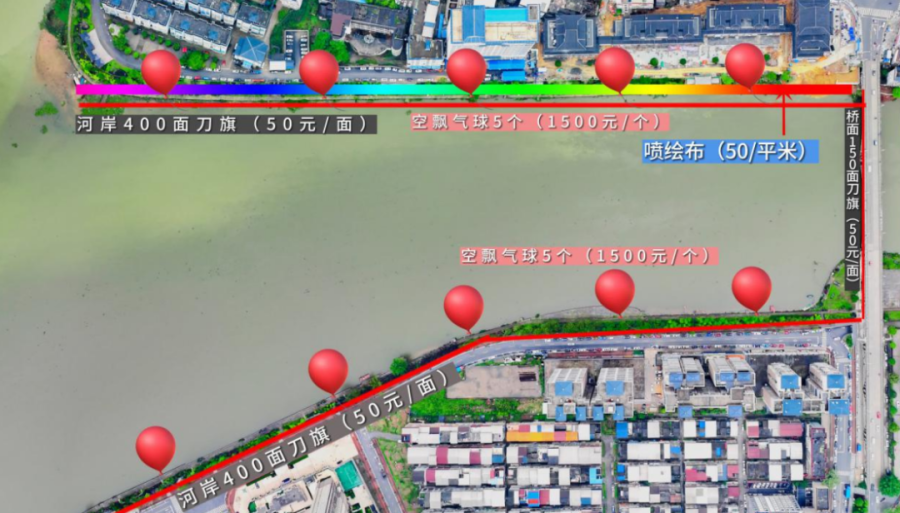2.空飘条幅,主要安排在沿河两岸,共6个,规格约高8米,宽70cm,费用1500元/个。展示周期:6月21日-23日。